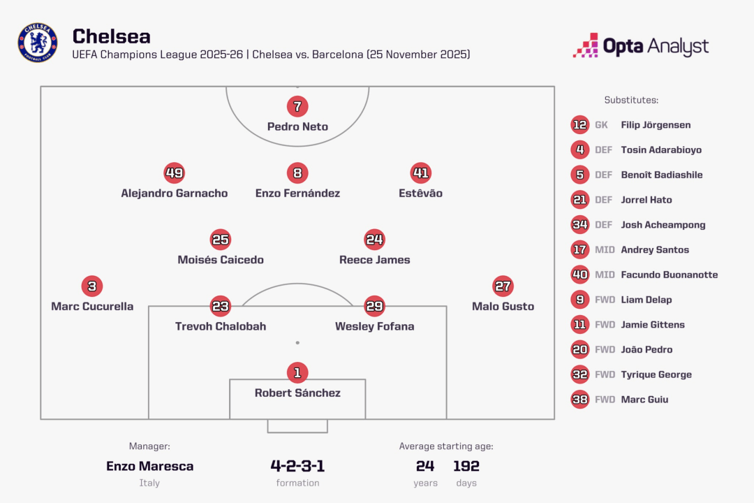 除了对阵巴塞罗那大放异彩的18岁巴西小将埃斯特旺,切尔西还拥有像加纳乔(21岁)、吉滕斯(21岁)和德尔普(22岁)这样的年轻攻击手。